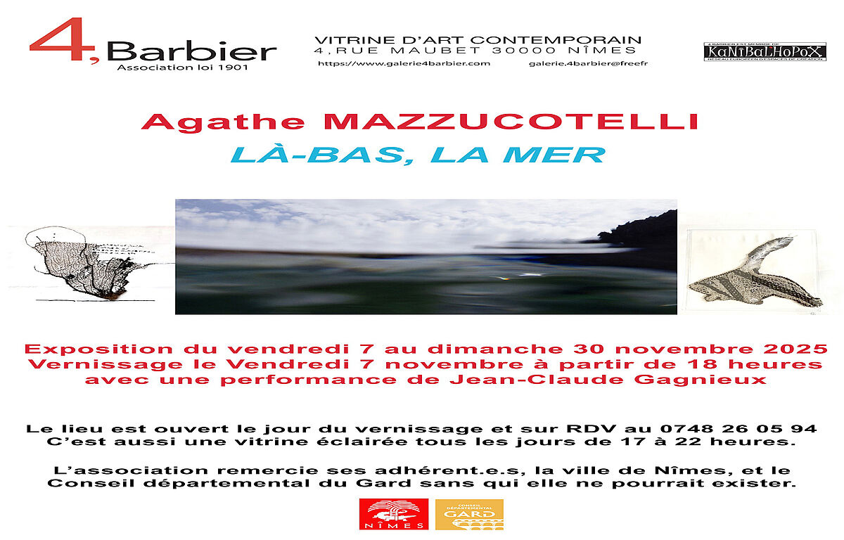 Exposition, Là-bas, la mer, Agathe Mazzucotelli. Vernissage le vendredi 7 novemnbre avec une performance de Jean-Claude Gagnieux.