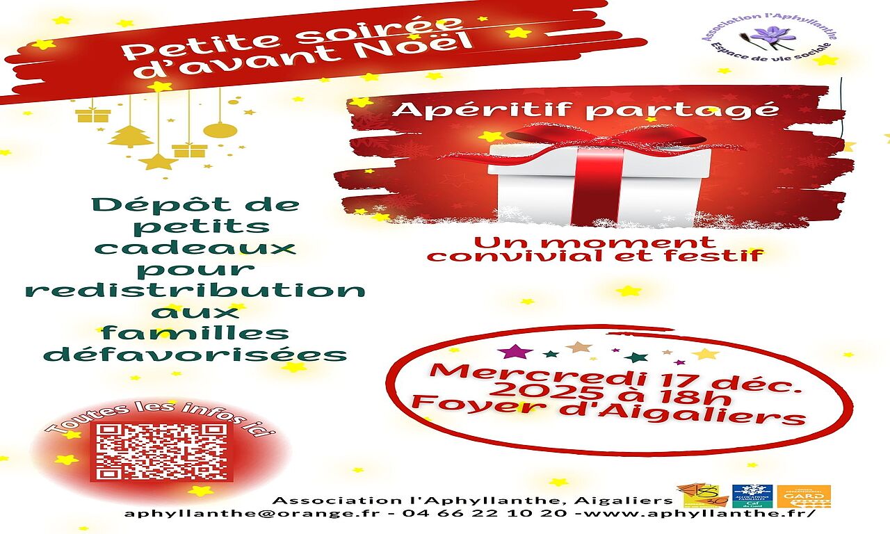 À l’initiative de l’atelier de conversation anglaise, l’Aphyllanthe invite toutes les bonnes volontés à un apéritif partagé et convivial. Et vous pouvez aider le Père Noël en déposant des petits cadeaux en faveur des familles défavorisées.