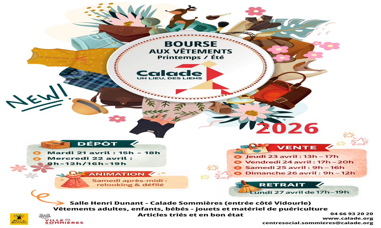 Calade organise sa Bourse aux vêtements, jouets et puériculture 2026. Dépôt des articles les 21 et 22 avril, vente du 23 au 26 avril, et retrait des invendus le 27 avril.