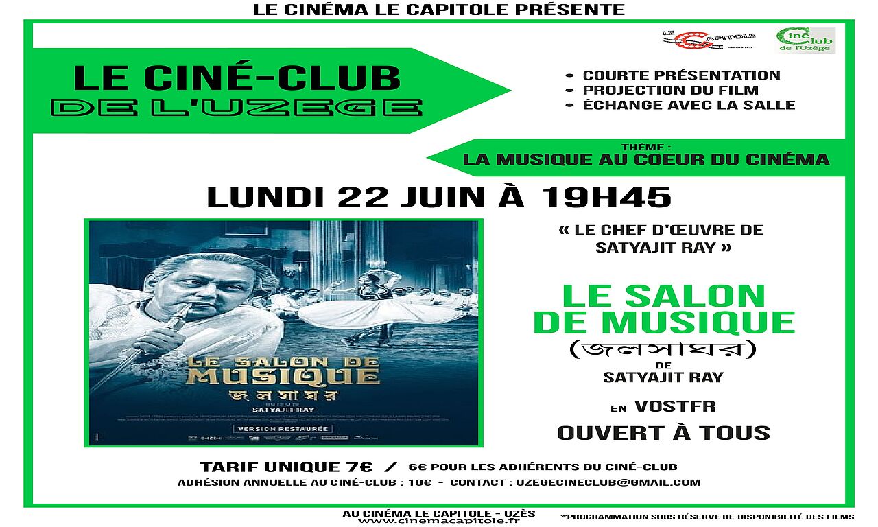 Le Ciné-Club vous propose cette année des films avec pour thème, "La musique au cœur du cinéma". À l'affiche pour la sixième session, "Le salon de musique" de Satyajit Ray. Un film d'une grande beauté formelle et d'une force tragique et pathétique.