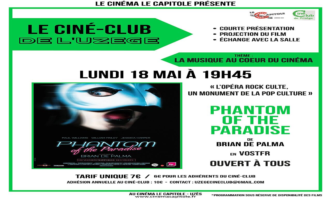 Le Ciné-Club vous propose cette année des films avec pour thème, "La musique au cœur du cinéma". À l'affiche pour la quatrième session, "Phantom of the paradise" de Brian de Palma, film musical qui s’inspire du Fantôme de l’Opéra de Gaston
