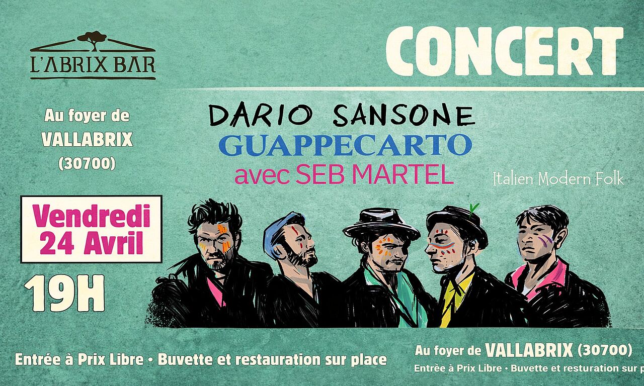 L’Abrix vous donne rendez-vous pour une soirée exceptionnelle au foyer avec Guappecarto, Dario Sansone (avec Seb Martel) et DJ Papaours (italo disco). Un voyage musical entre folk méditerranéen, musique du monde et influences italiennes moderne !