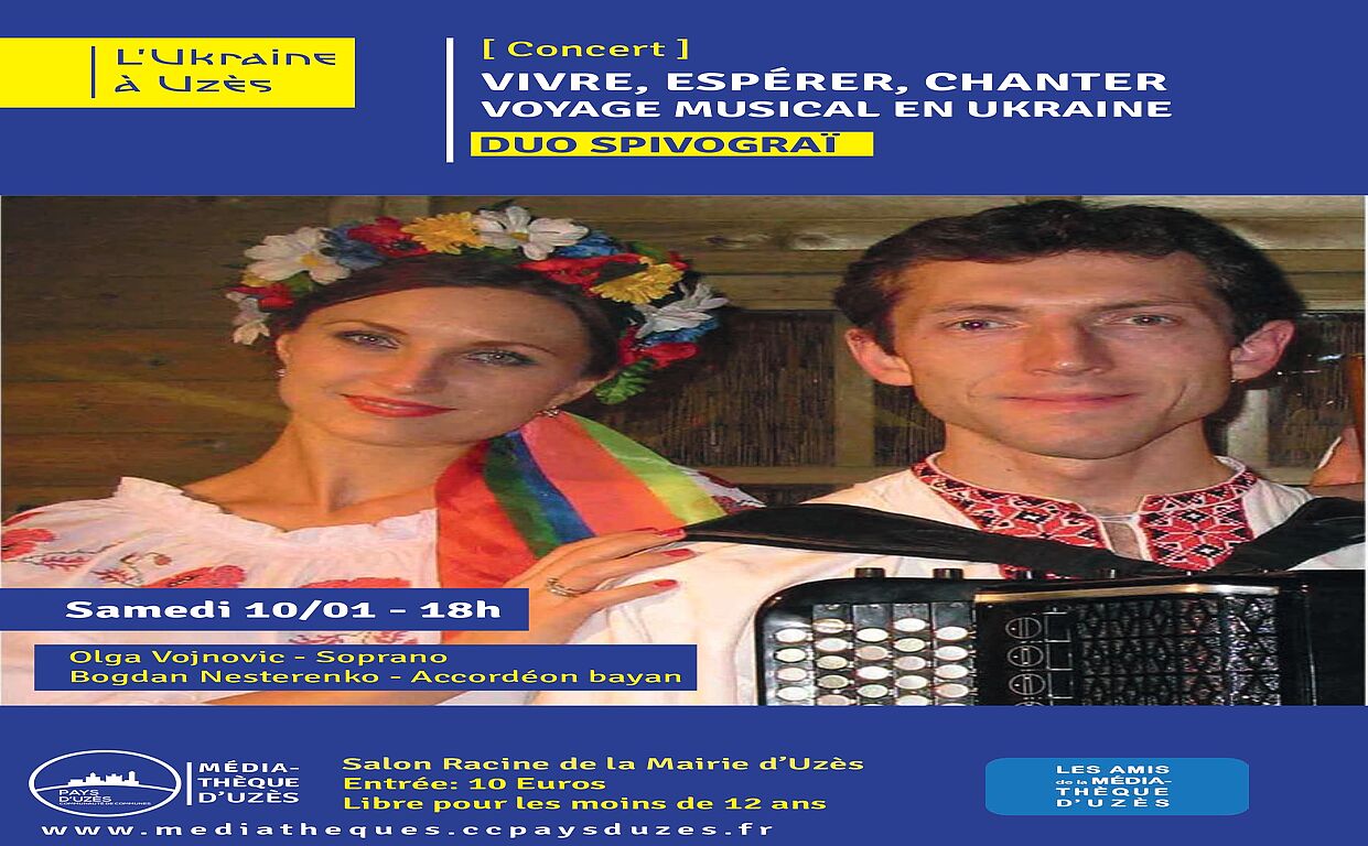 Dans le cadre du cycle "L'Ukraine à Uzès", Les amis de la médiathèque vous invitent à un concert du duo Spivograï. Avec Olga Vojnovic (soprano) et Bogdan Nesterenko à l'accordéon bayan. "Vivre, espérer, chanter" : un voyage musical en Ukraine.