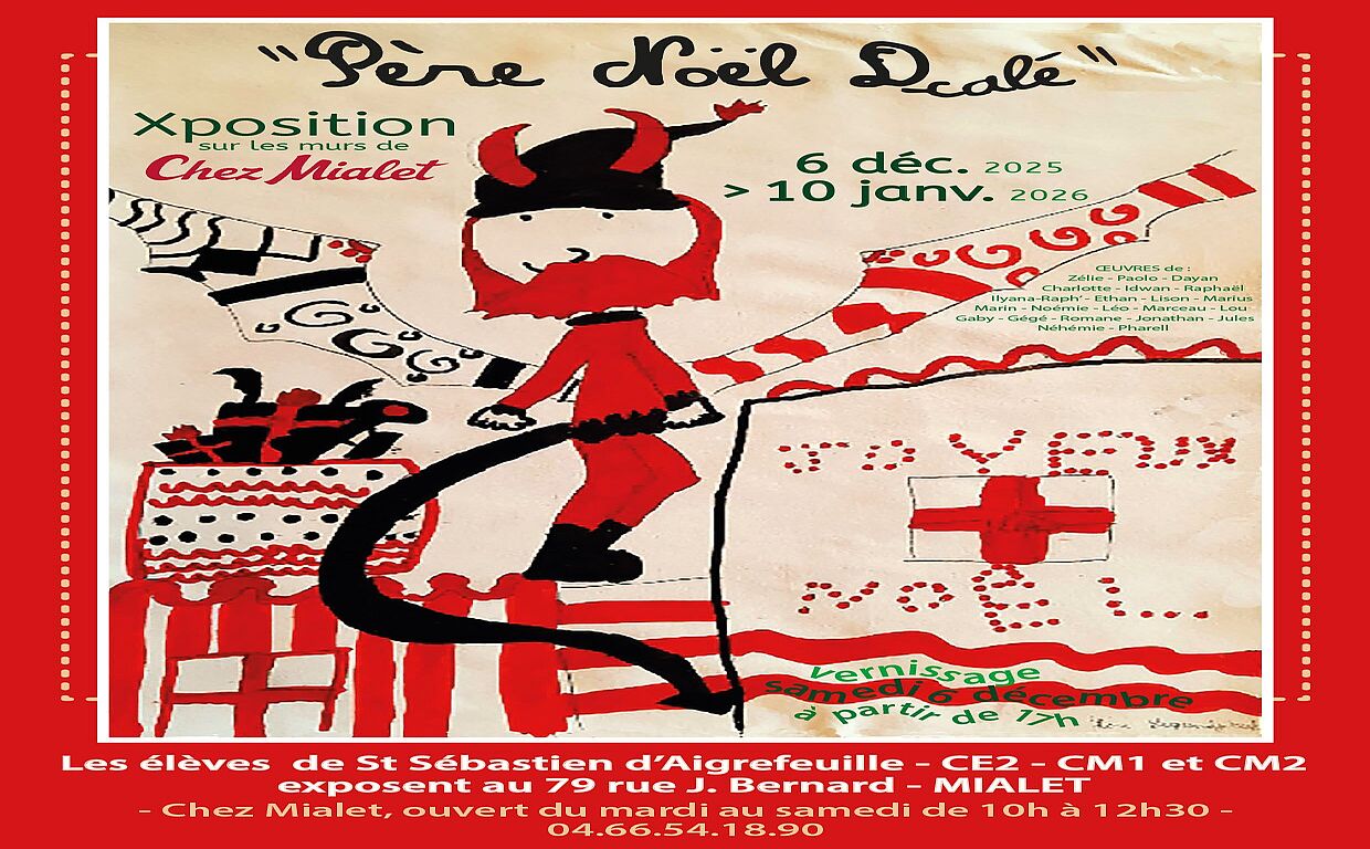 Xposition sur les murs de Chez Mialet des oeuvres des élèves de St Sébastien d'Aigrefeuille, CE2, CM1 et CM2.