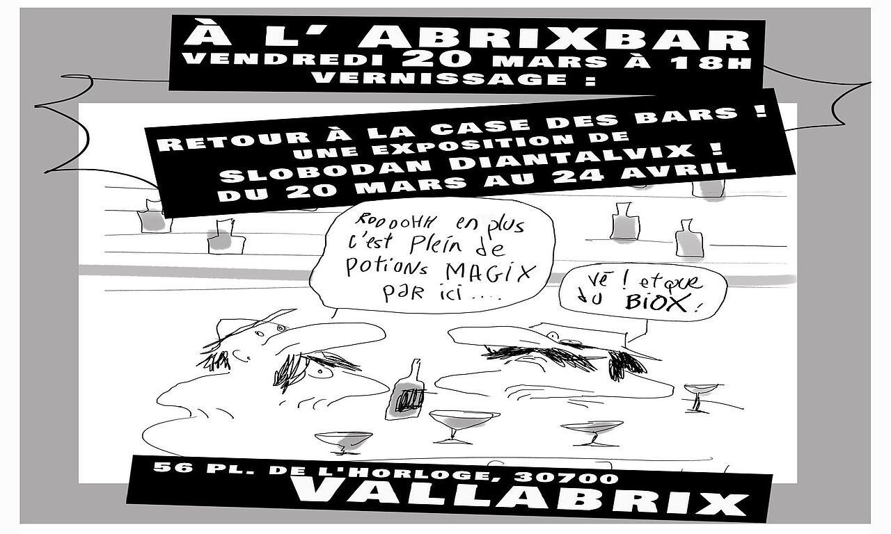 L'Abrix bar accueille les dessins de Slobodan DiantalviX (un duo d'artistes nîmois) qui met des images à boire dans des cadres chinés et issus de la récup’. Une exposition pleine d'humour et de clins d'œil caustiques à l'actualité.