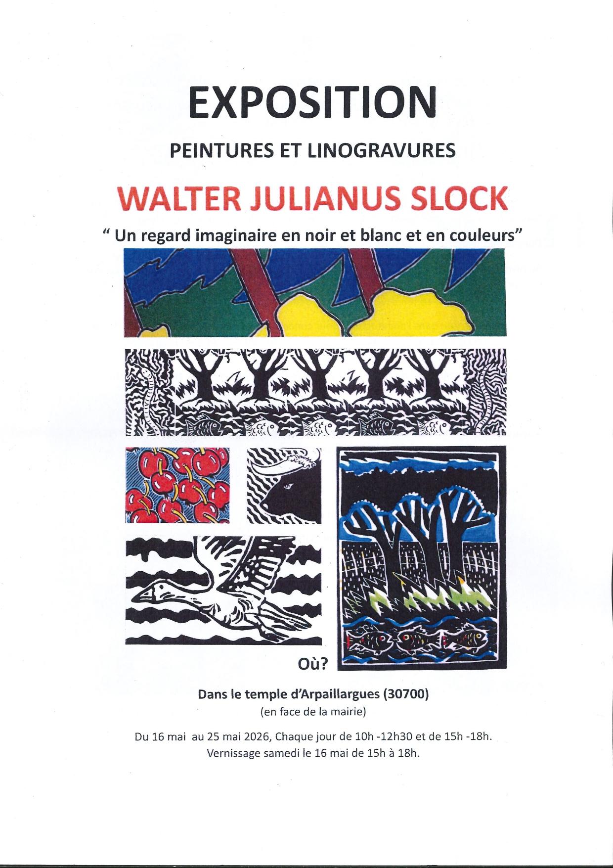 Concernant la peinture et les linogravures, Walter Julianus Slock s'estime autodidacte. Ses œuvres ne peuvent pas cacher les passions qu'il a gardées de ses premiers amours, la B.D. Les B.D. et les animations sont les racines de ses œuvres.