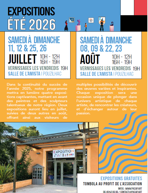 Dans la continuité du succès de l'année 2025, le programme de l'association PACAP mettra en lumière quatre expositions captivantes, mettant en avant des peintres et des sculpteurs talentueux de notre région. On vous attend nombreuses et nombreux !