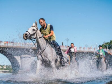 Dans le même esprit que la Gardonnenque, les gardians s’affrontent dans le lit du Gardon durant une course de chevaux.