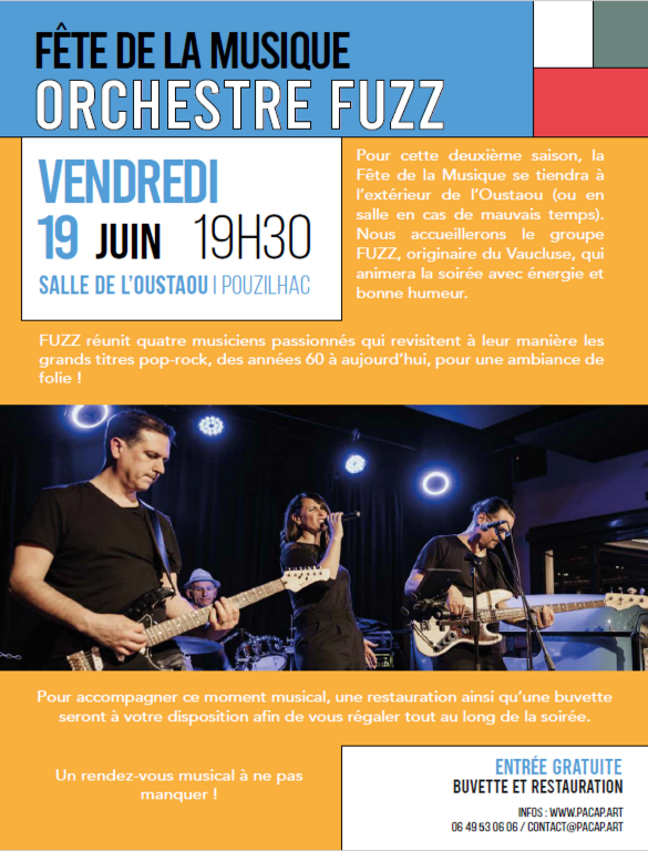 À l’occasion de la musique, l’association P.A.C.A.P, a le plaisir d’offrir un concert gratuit du groupe FUZZ, originaire du Vaucluse, qui animera la soirée avec énergie et bonne humeur.