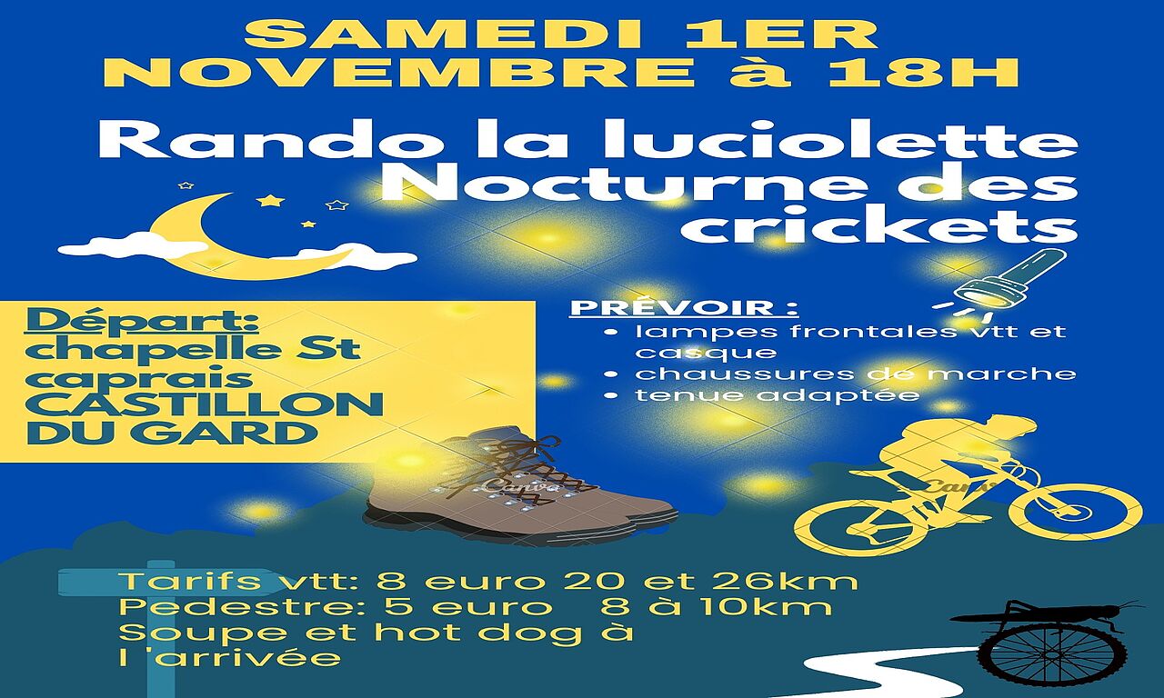 Le club de VTT de Remoulins Les Crickets vous propose une randonnée pédestre de 8 à 10 km et deux parcours en VTT à la frontale sous les étoiles ! Soupe et hot-dog à l'arrivée pour vous récompenser !