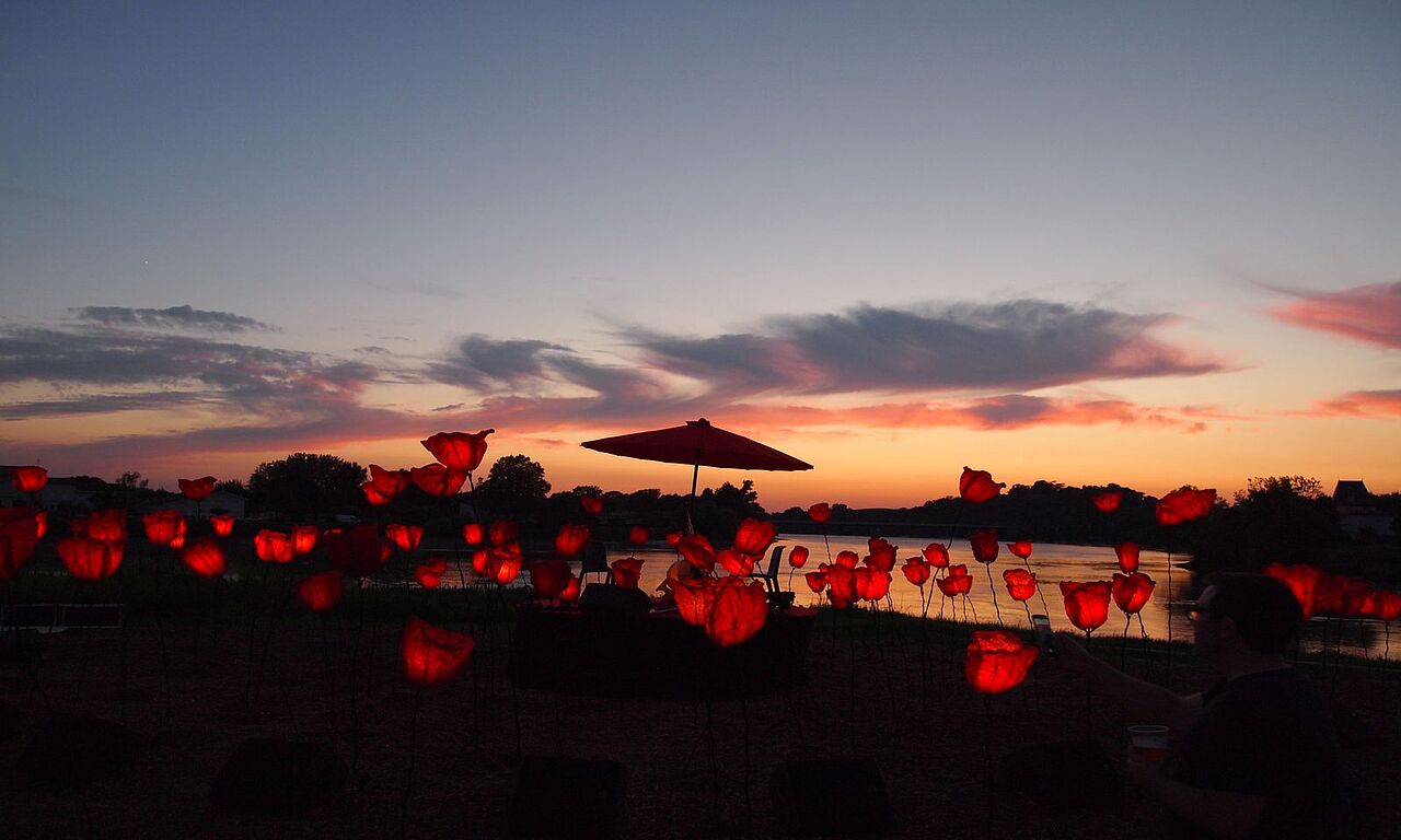 60 coquelicots géants s’illuminent à la tombée de la nuit. 60 respirations, 60 battements de coeur… Pour le concert, autour d’eux, deux musiciens – kora et violoncelle – sculptent le silence.