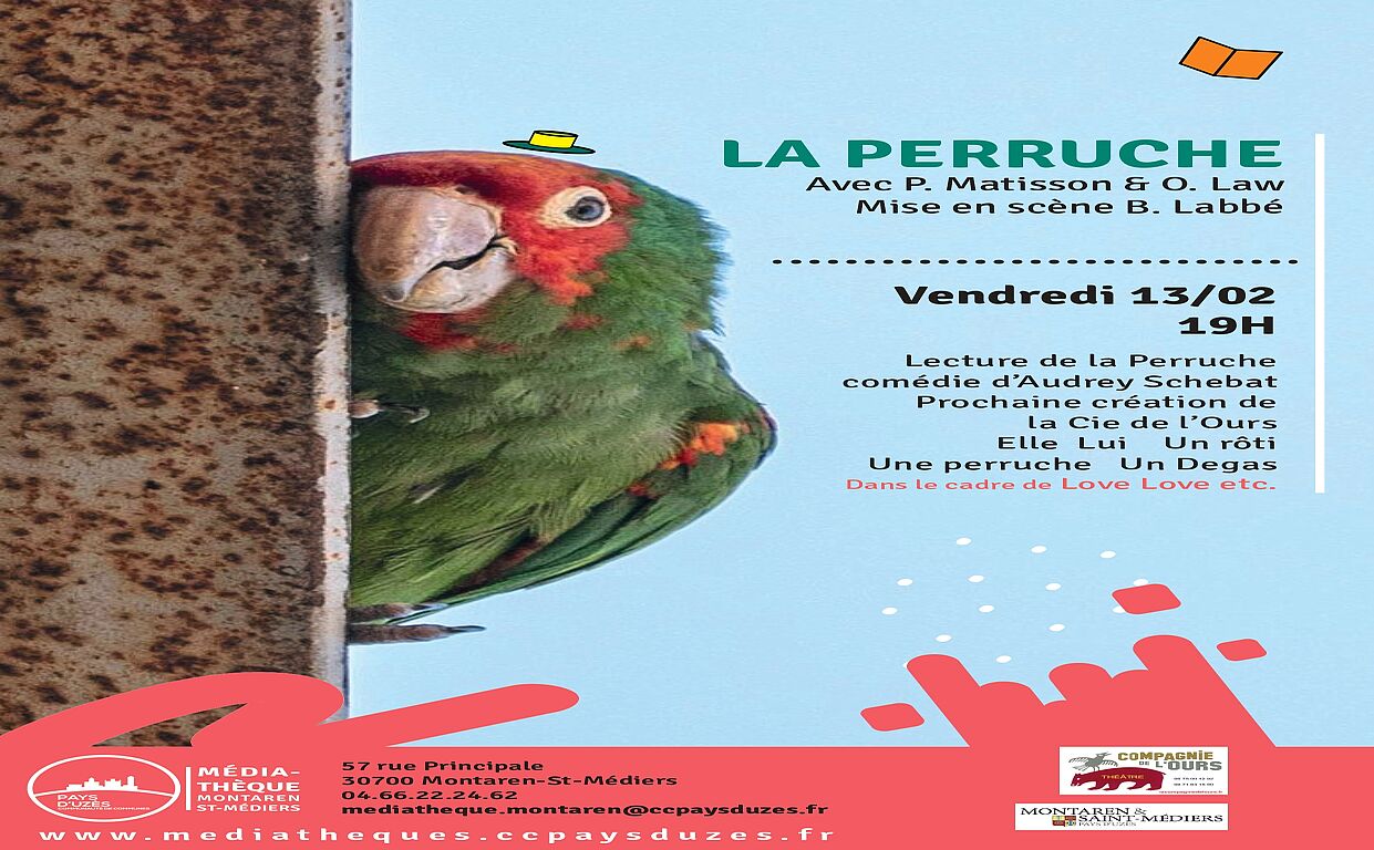 Dans le cadre de la 8ᵉ édition de l'évènement Love Love etc…du réseau des médiathèques, la compagnie de l'Ours propose une lecture théâtralisée de la pièce La perruche, comédie d'Audrey Schebat, présentée en 2019 aux Bouffes Parisiennes.