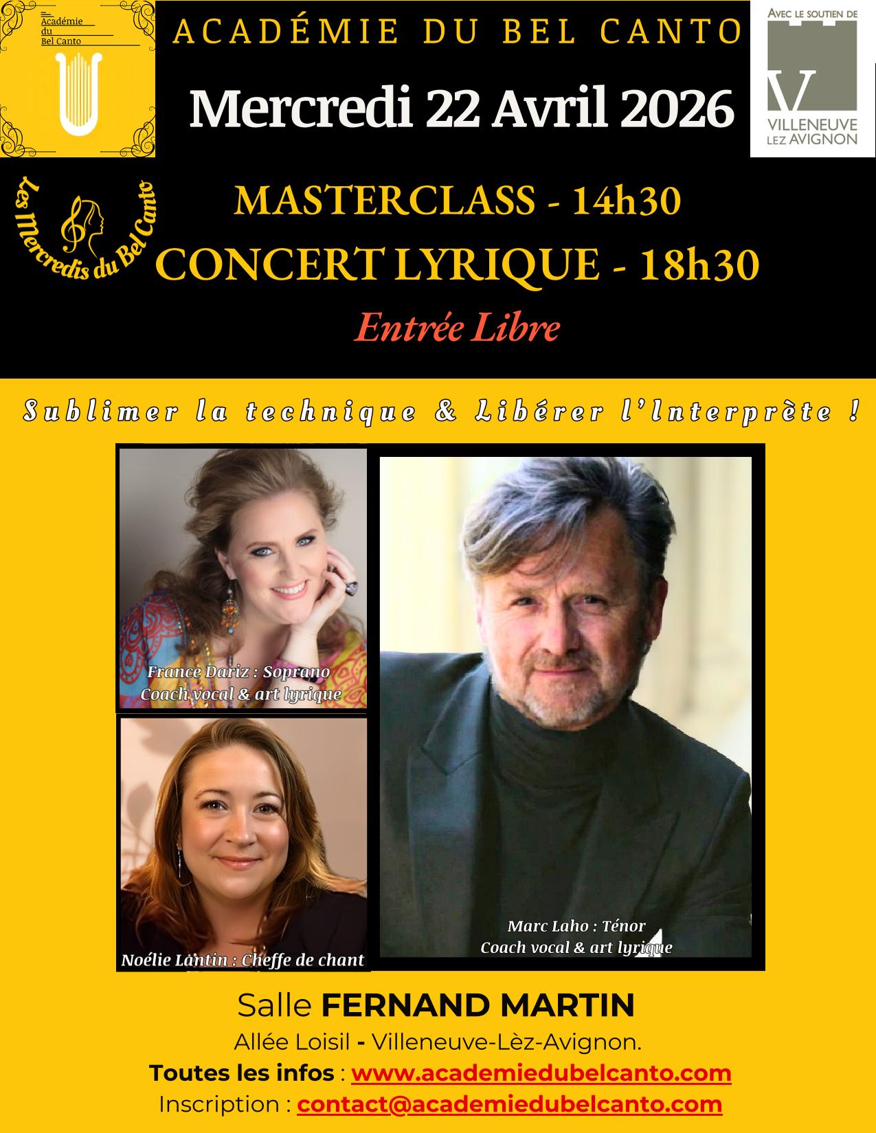 L’Académie du Bel Canto vous invite au concert Lyrique des « Mercredis du Bel Canto ». Une journée dédiée à l’art lyrique, avec à partir de 14h30, la Master Class de jeunes chanteurs lyriques professionnels suivie d’un concert de restitution à 18h30.
