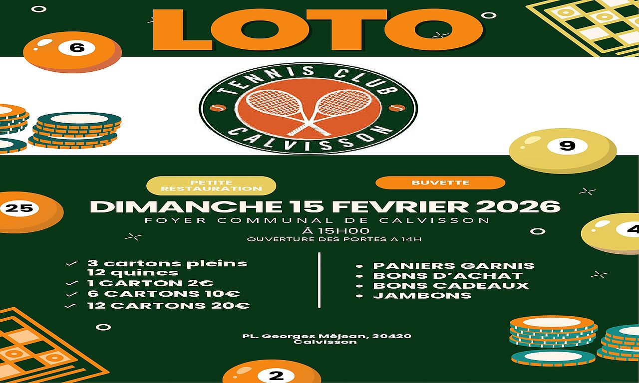 Loto du club de tennis de Calvisson. 12 quines, 3 cartons pleins, bons d'achat, bons cadeaux, jambon, paniers garnis ... Tombola.