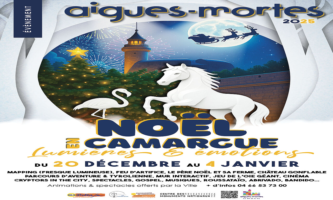 Noël en Camargue à Aigues-Mortes : chaque jour, des animations pour petits et grands ! Parcours d’aventure, tyrolienne, jeux géants, spectacles, ferme du Père Noël, feu d’artifice et mappings lumineux pour vivre ensemble la magie des fêtes en Camargue.