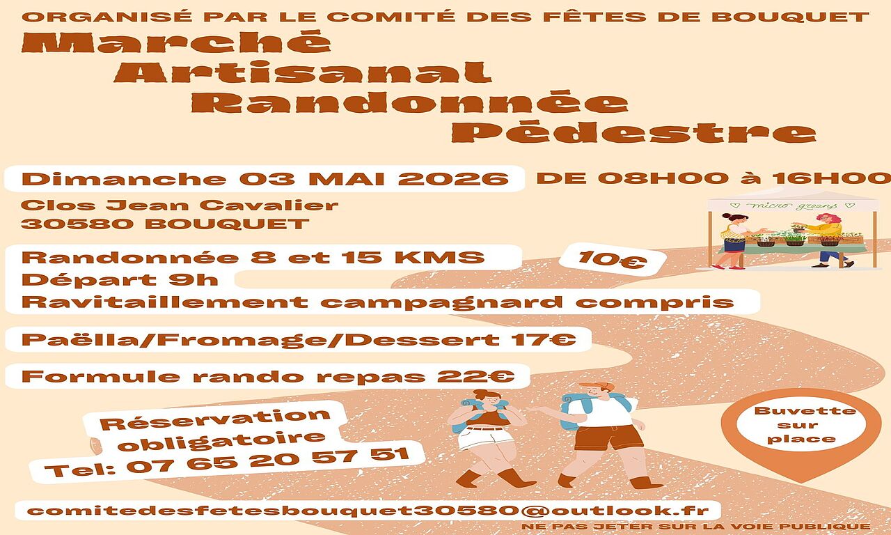 Le Comité des fêtes de Bouquet organise une randonnée avec deux parcours pour tous les niveaux. Que vous soyez grand marcheur ou amateur de produits locaux, il y en a pour tous les goûts. Profitez de nos beaux paysages. Sur réservation.