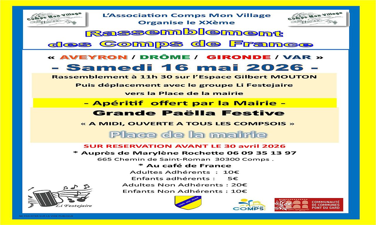 Pour la grande paella du Rassemblement des Comps de France, organisée par "Comps mon village" la mairie offre l’apéritif ! De quoi rendre cette journée encore plus conviviale. Le groupe Li Festejaire animera le rassemblement.