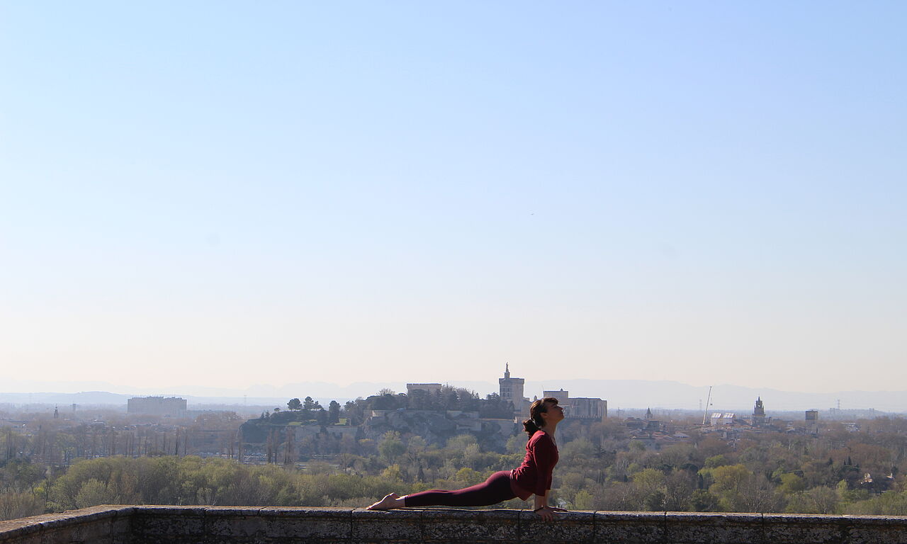 Une séance de yoga sur les terrasses panoramiques ou sous l’oliveraie centenaire. Face au Palais des Papes, au Ventoux et aux Alpilles, un moment de méditation pour vivre les jardins autrement avec Camille Roux (Inspire Yoga).