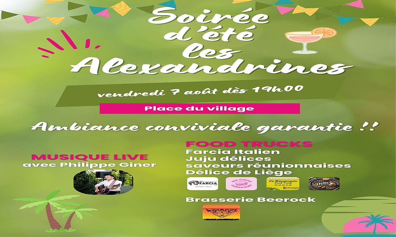 Musique live avec Phil Giner, food trucks variés : Farcia Italien, Juju Délice Burger, Délices de Liège (gaufres), saveurs réunionnaises, brasserie Beerock.