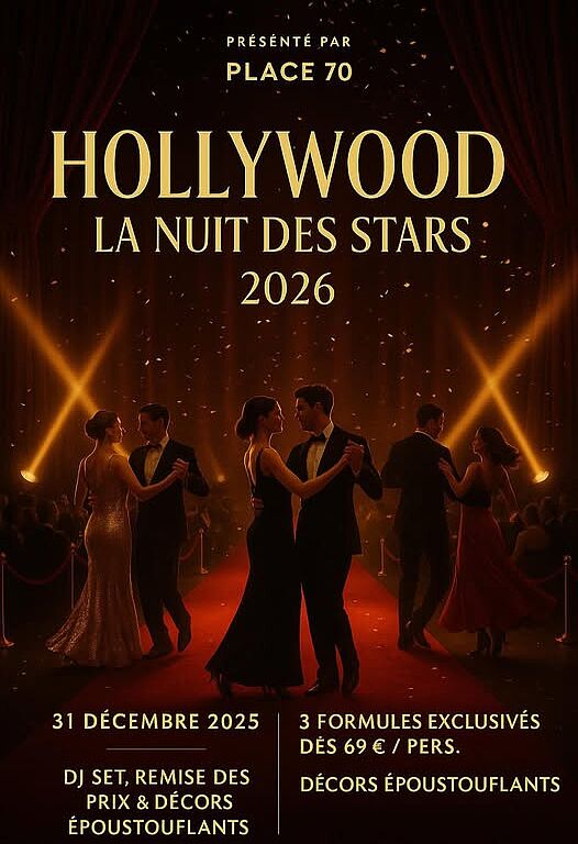 Cette année, Place 70 déroule le tapis rouge pour un réveillon d’exception ! Vivez votre propre montée des marches dans une ambiance Hollywoodienne, entre glamour, fête, et grandes musiques de films.