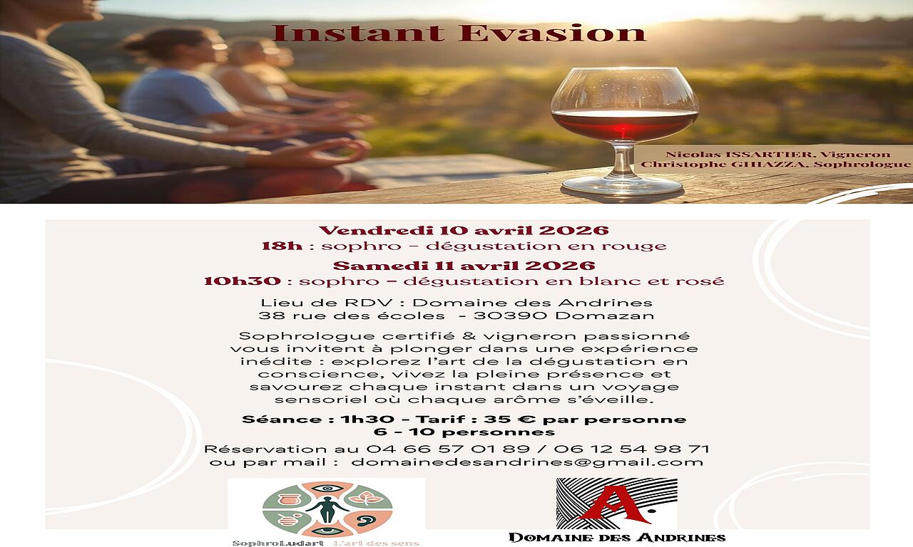 Instant évasion, c’est la rencontre de deux univers : la sophrologie et le vin. Christophe Ghiazza, sophrologue, et Nicolas Issartier, vigneron, s’associent le temps de deux séances pour faire vivre aux participants une expérience inédite.