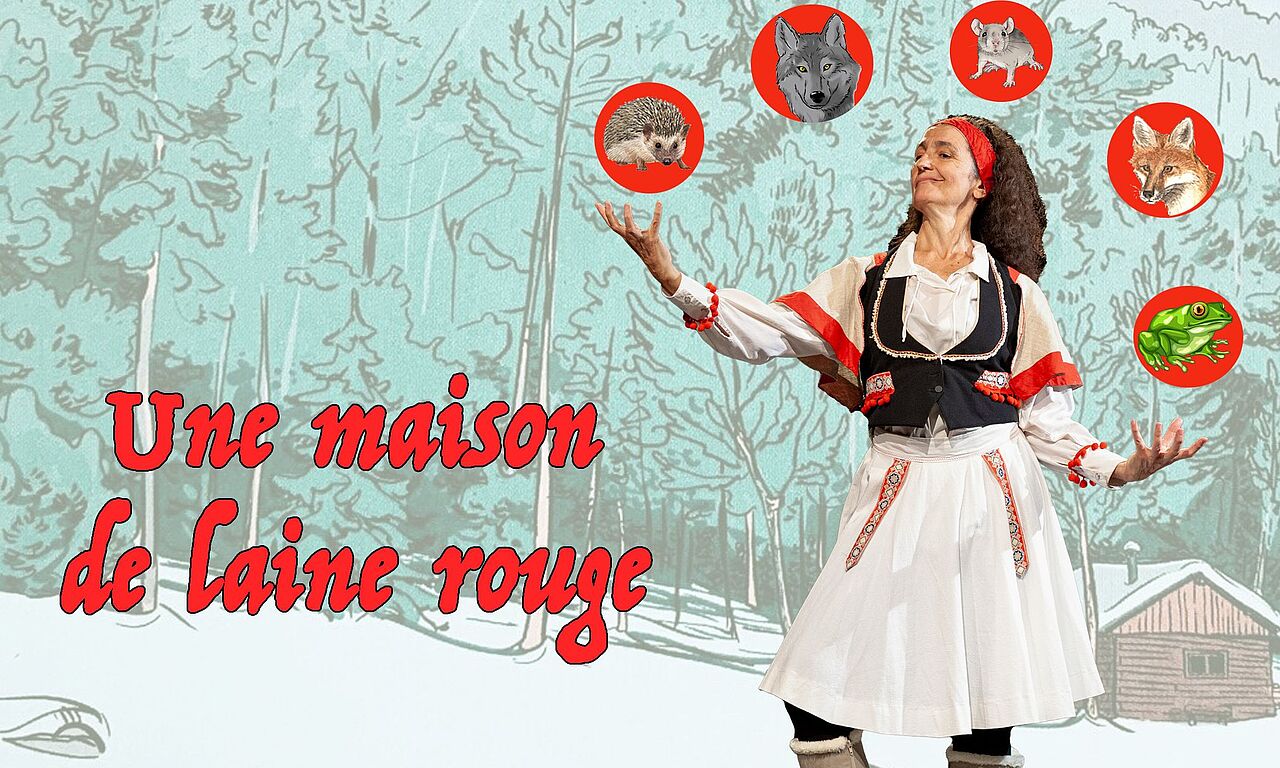 "Une maison de laine rouge", une adaptation très libre du célèbre conte "La moufle", mêlée d'un conte sur le thème du fort et du faible, et de contes étiologiques truffés de personnages drôles et émouvants. Un spectacle jubilatoire.