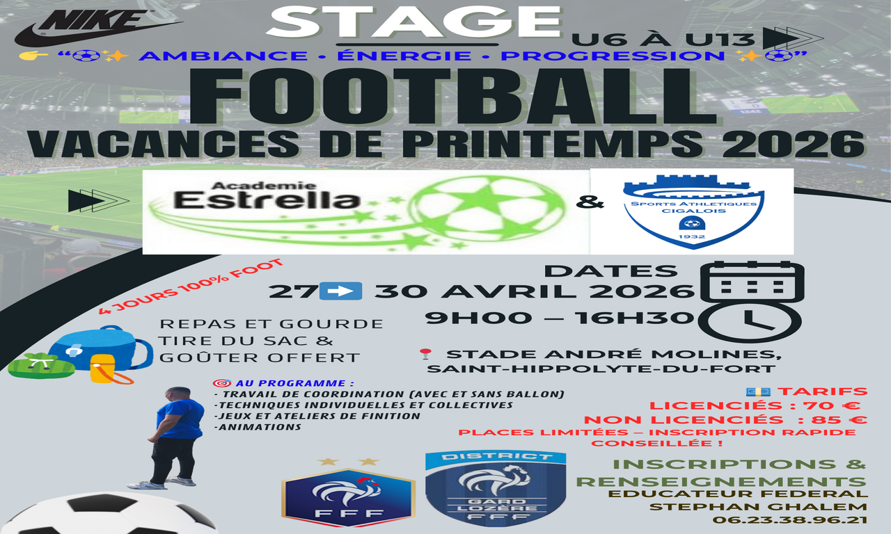 Pendant les vacances de Printemps 2026, l’Académie Estrella, en partenariat avec le Sports Athlétiques Cigalois (SAC), organise un stage de football à destination des jeunes de U6 à U13, licenciés ou non.