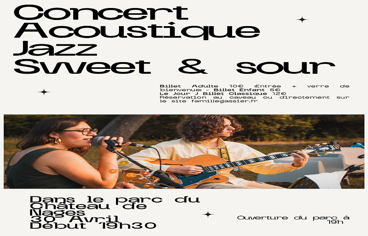 Nous avons le plaisir d’accueillir le groupe Sweet & Sour pour une soirée musicale jazz, dans le cadre exceptionnel du parc du Château de Nages.