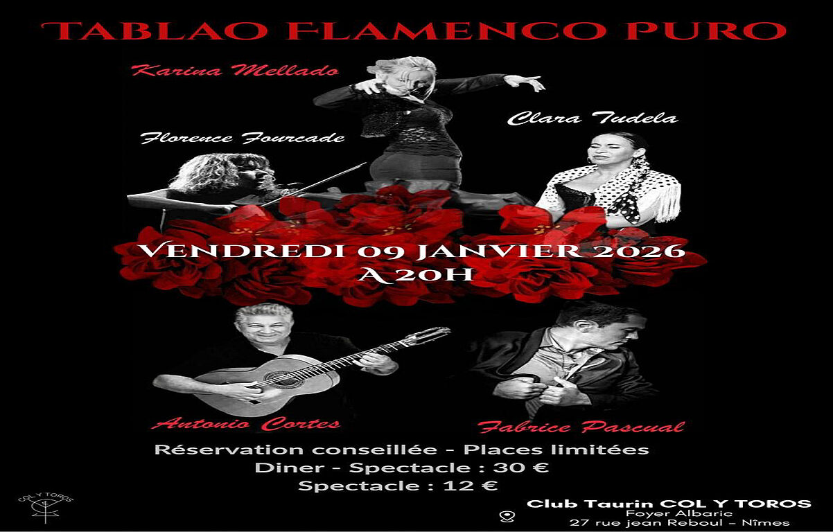 Tablao Flamenco Puro au Club taurin Col y Toros : à 20h, Karina Mellado Cristi et ses invités célèbrent les 20 ans du club. Une soirée intense, entre passion et tradition, avec dîner en option