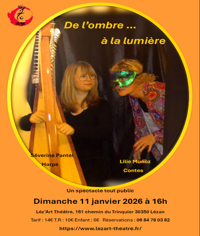 Le spectacle «  De l’ombre à la lumière  » est un duo poétique et joyeux entre la conteuse Lilie Muñoz et la musicienne Séverine Pantel. Il sera suivi d’un temps d’échanges et de partage de la galette des Rois.