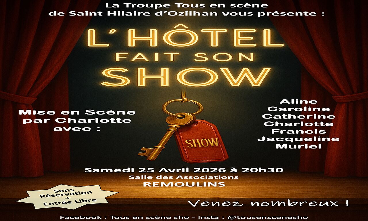 La troupe Tous en Scène SHO présente «  L’Hôtel fait son show  » : un spectacle d’humour rythmé, enchaînant des situations déjantées et des personnages hauts en couleur. Une soirée dynamique et conviviale, placée sous le signe du rire.