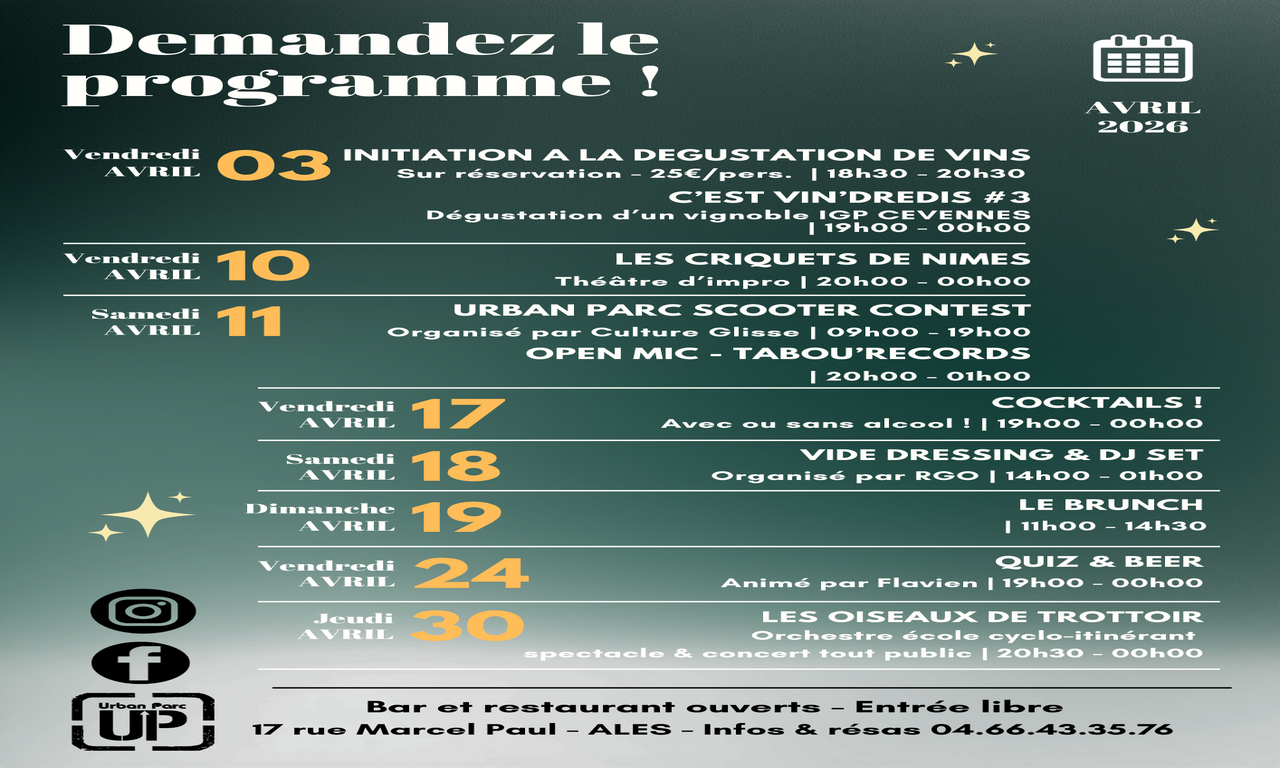 Distractions et loisirs, Alès:Urban Parc - Programme Avril