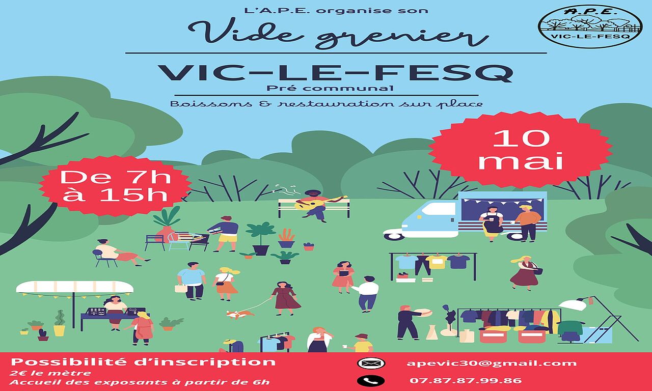 L'association des Parents d'élèves de Vic le Fesq organise un vide grenier sur la journée du dimanche 10 Mai 2026, au pré communal de Vic le Fesq, sur la pelouse sous les arbres. Une buvette et petite restauration sera prévue tout au long de la journée.